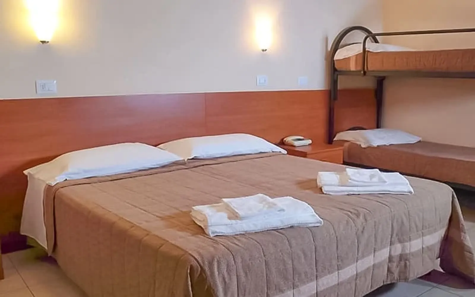 03. Camera multiplaPer le famiglie più numerose ecco le camere adatte. Da 4 o 5 posti letto, ottima pulizia e elevata qualità dei servizi. Aria condizionata e letti ortopedici garantiscono un perfetto riposo, il box doccia è estremamente funzionale, la luminosità della camera rende lo spazio armonioso e accogliente. |