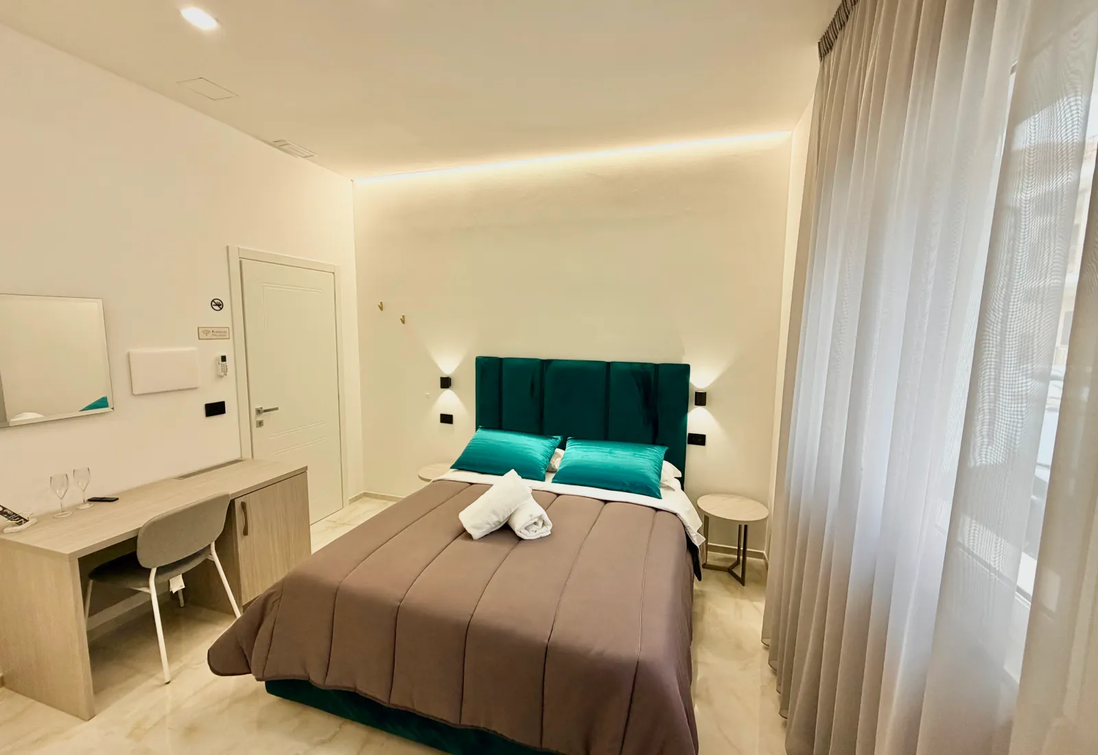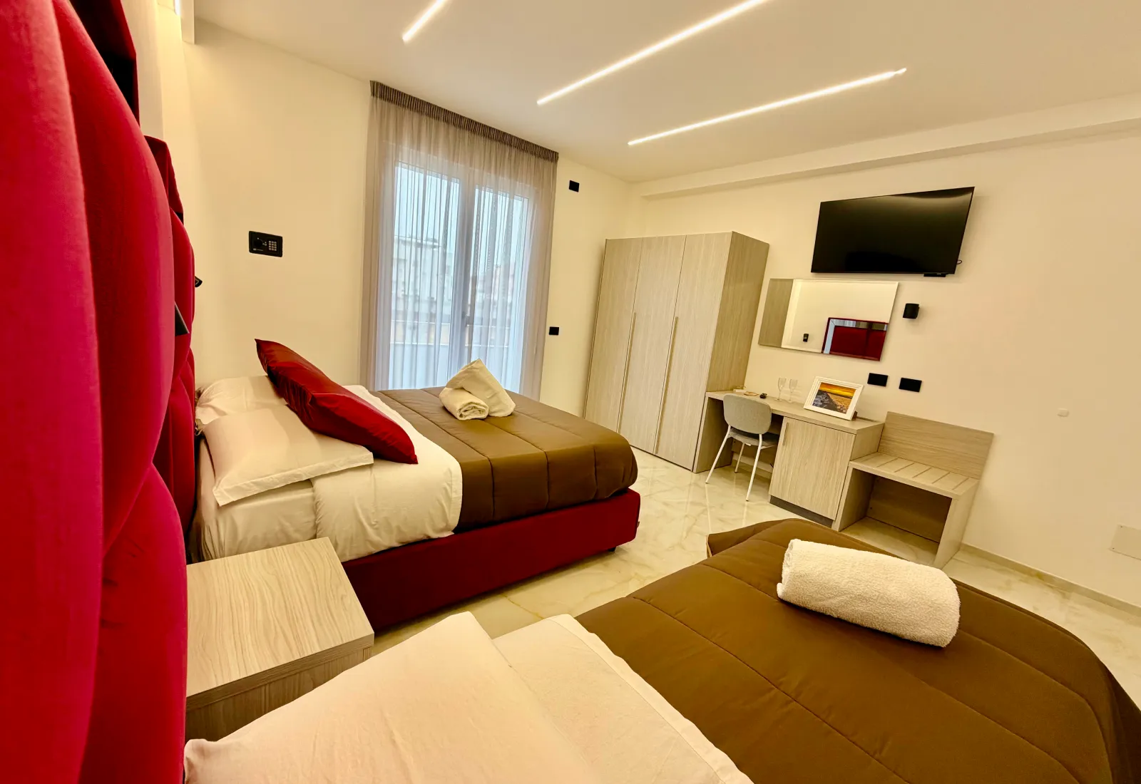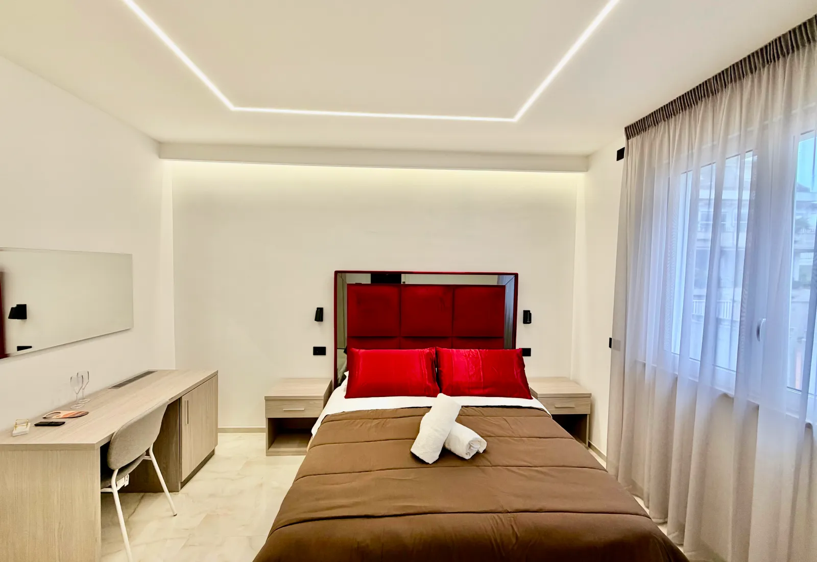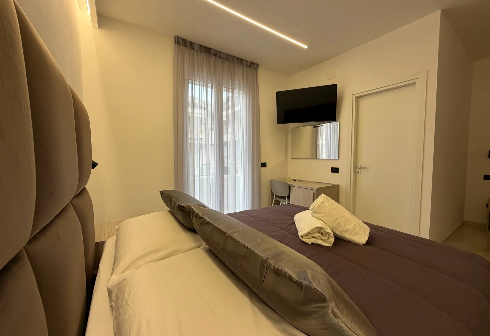 01. Matrimoniale LuxuryLe camere matrimoniali Luxury sono ideali per coppie in cerca di comfort e tranquillità. Spaziose, luminose e dotate di balcone, uniscono arredi eleganti e servizi completi per garantire un soggiorno rilassante e piacevole. |