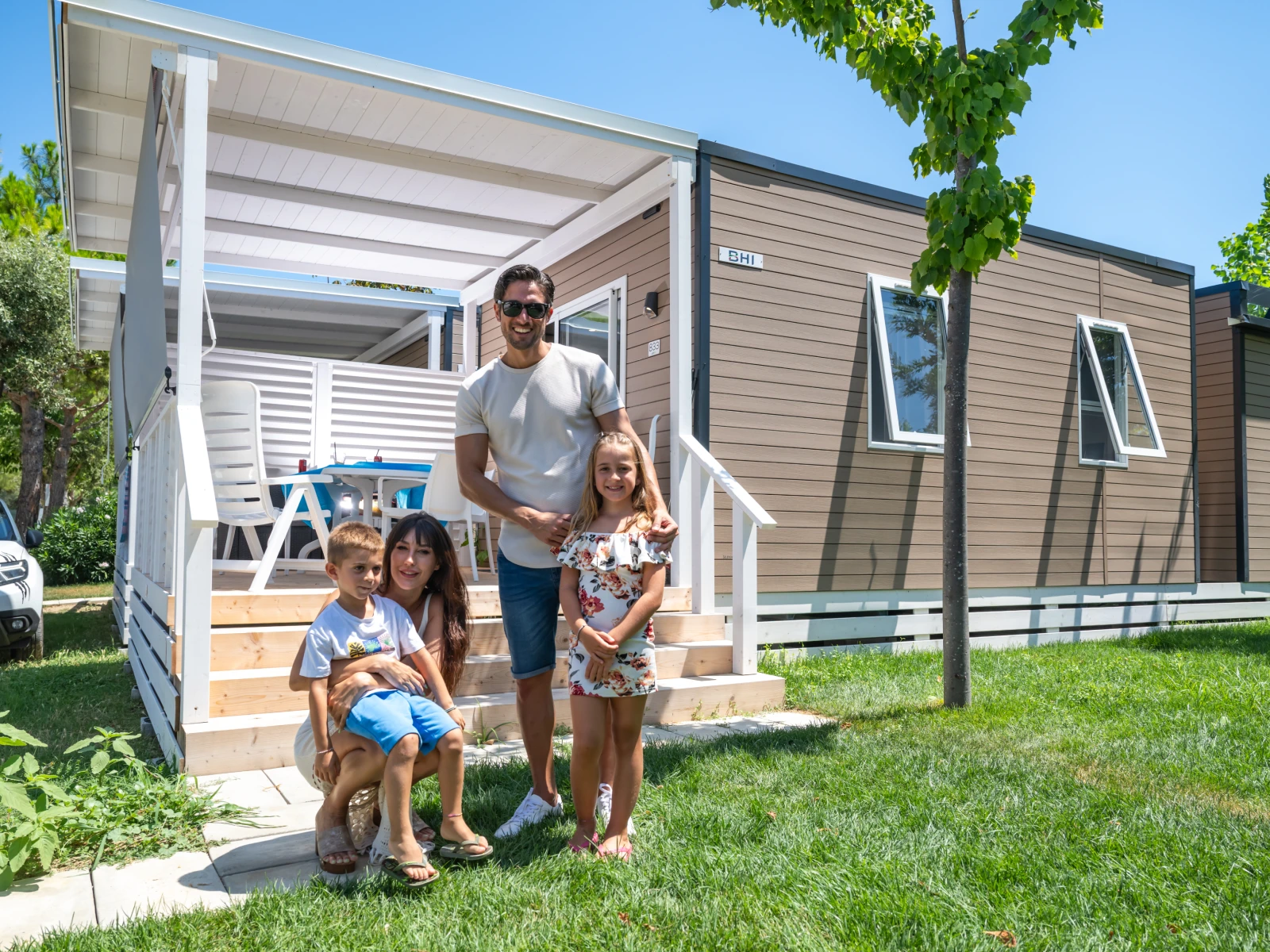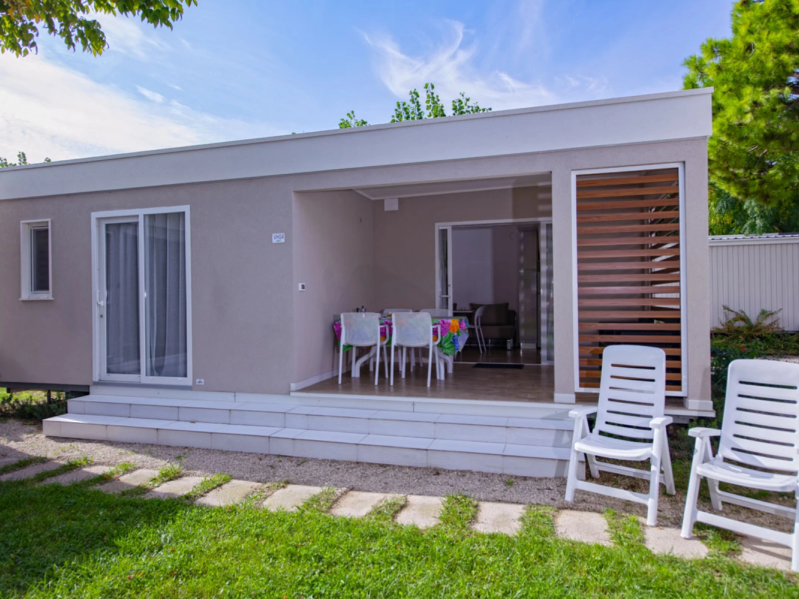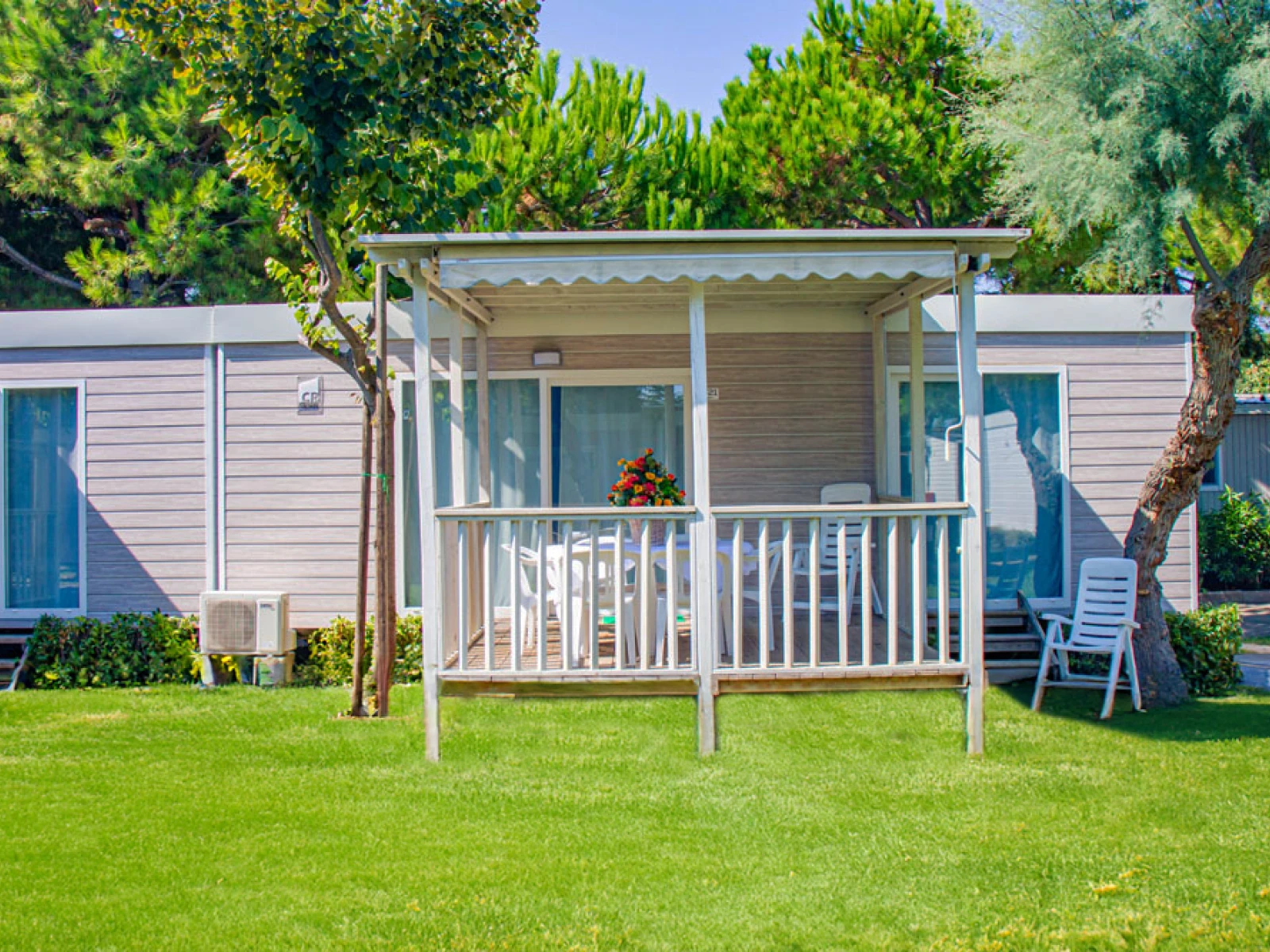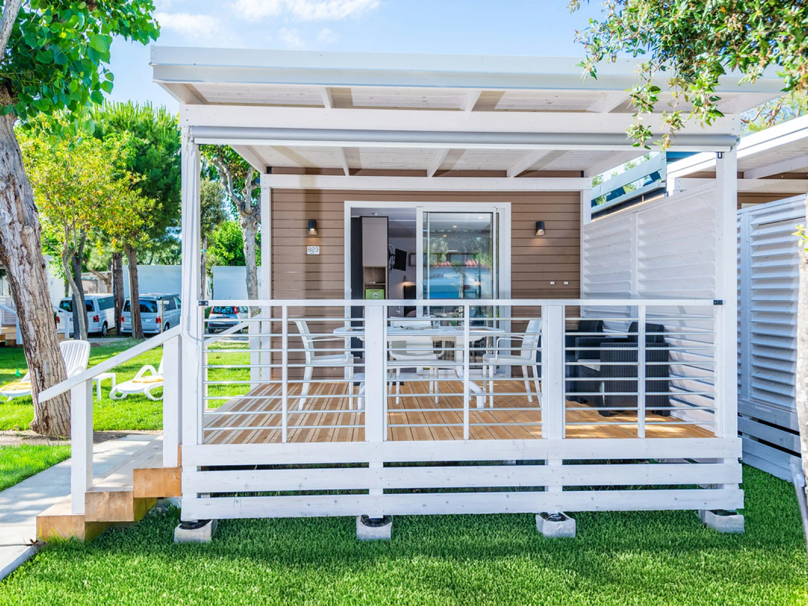 01. Casa mobile MalibùIl trilocale da 42,5 m² ospita fino a 4 persone. Include soggiorno con cucina attrezzata e dinette con letto, una camera matrimoniale e una camera con letto basso ed estraibile, oltre a un bagno con cabina doccia. È dotato di lavastoviglie, microonde, TV, cassaforte e climatizzazione. La veranda arredata con tavolo, sedie e due sdraio amplia gli spazi per vivere all’aperto. |