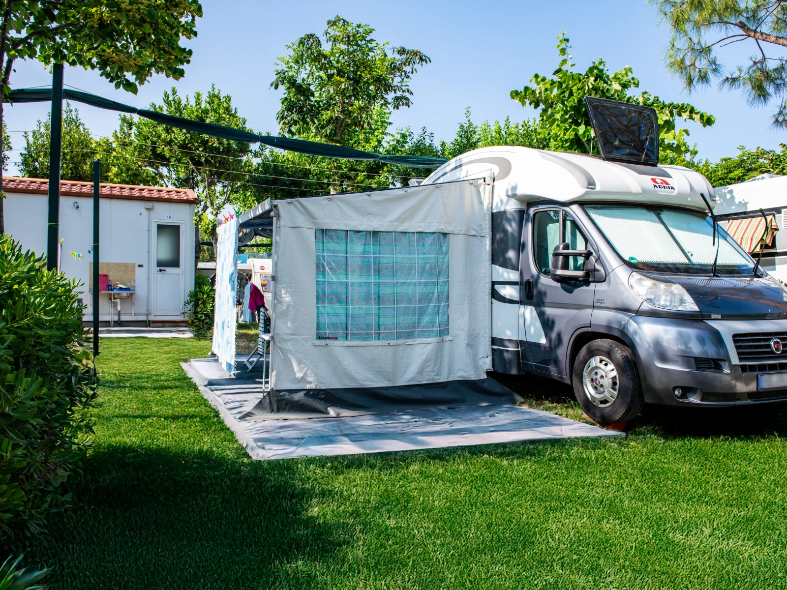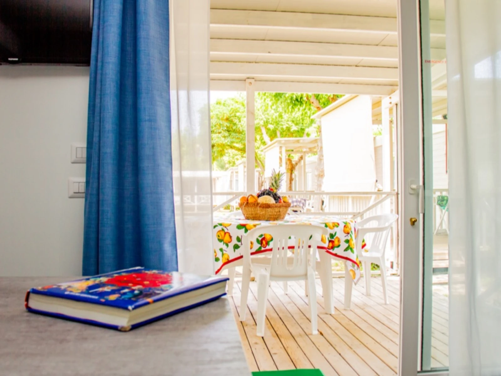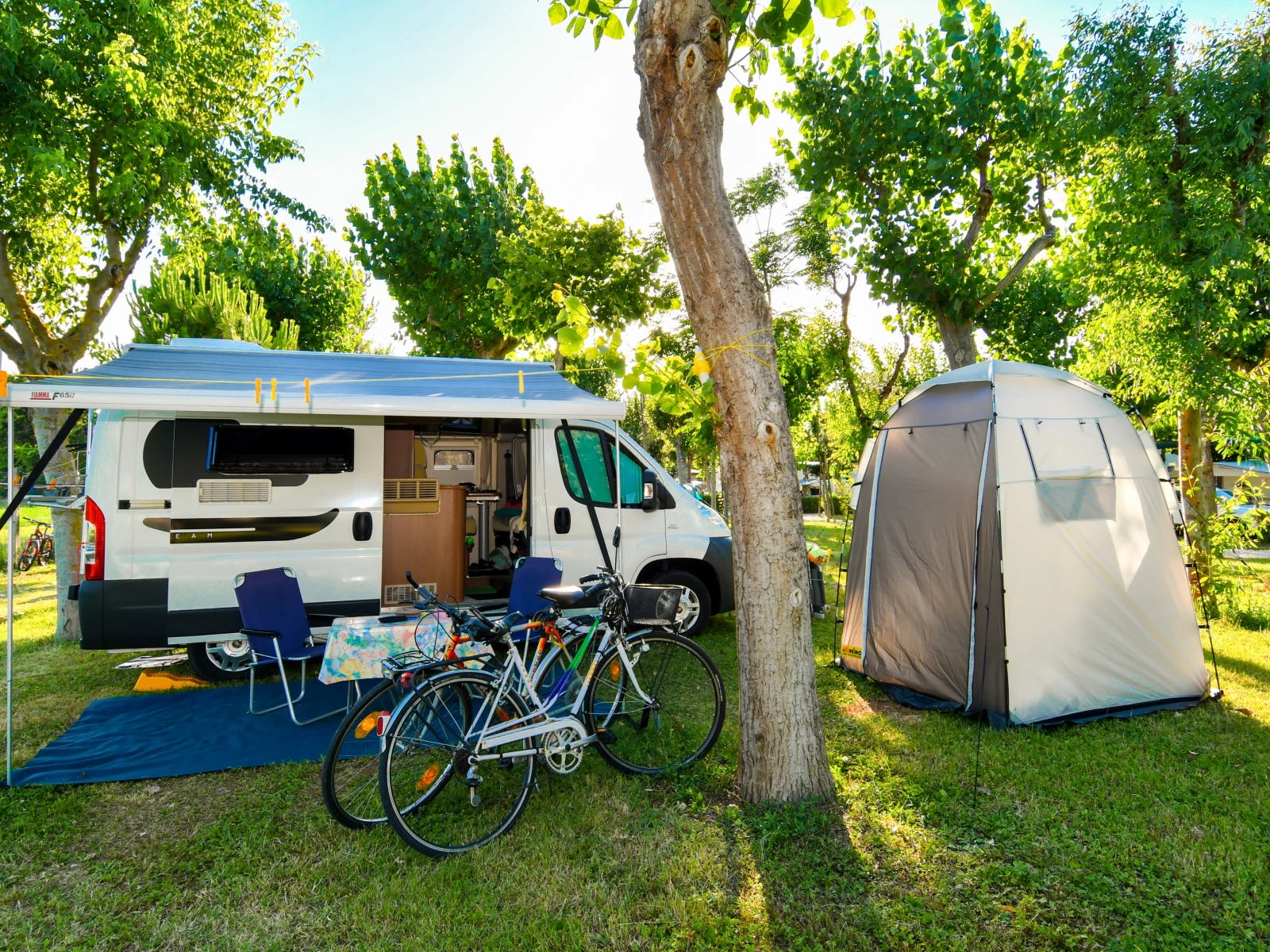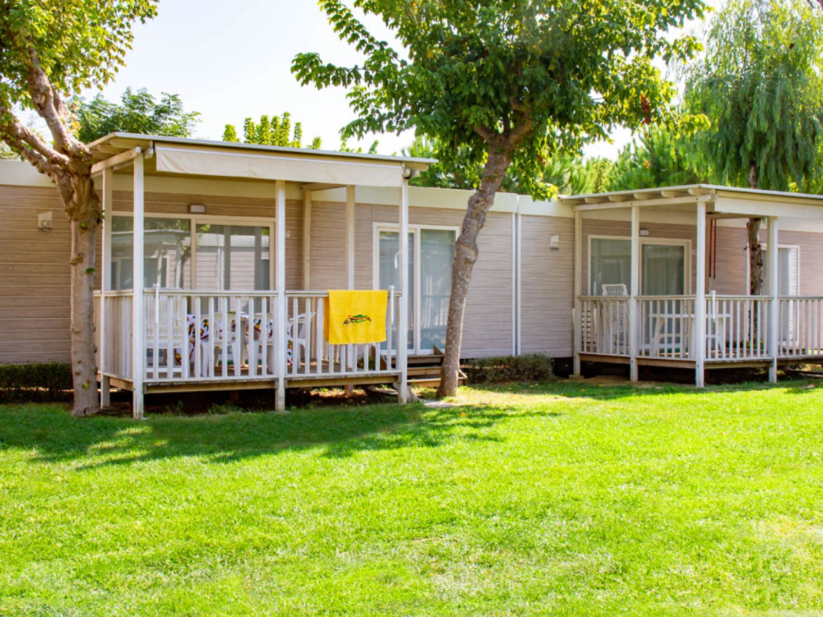 01. Casa mobile MalibùIl trilocale da 42,5 m² ospita fino a 4 persone. Include soggiorno con cucina attrezzata e dinette con letto, una camera matrimoniale e una camera con letto basso ed estraibile, oltre a un bagno con cabina doccia. È dotato di lavastoviglie, microonde, TV, cassaforte e climatizzazione. La veranda arredata con tavolo, sedie e due sdraio amplia gli spazi per vivere all’aperto. |
