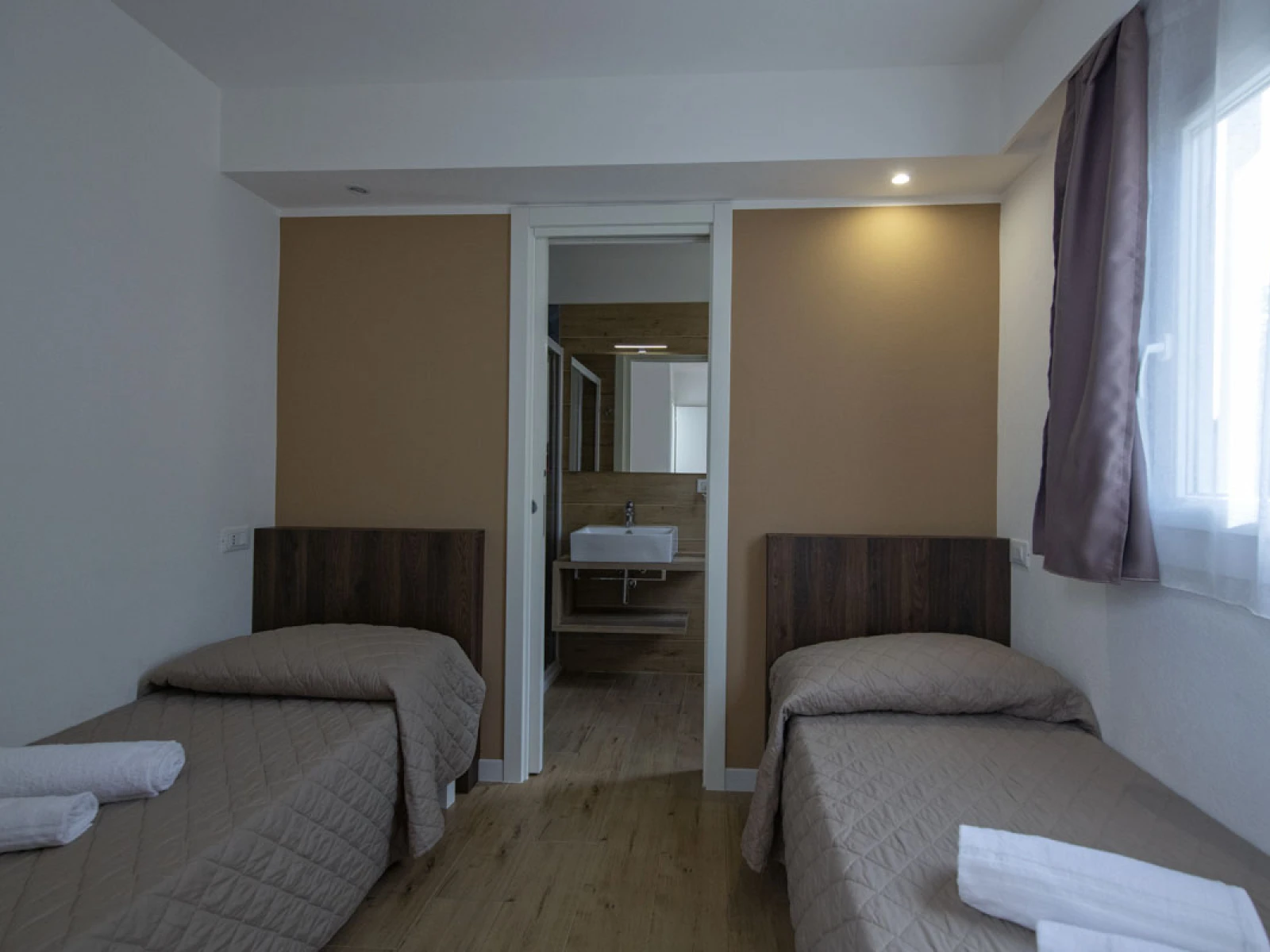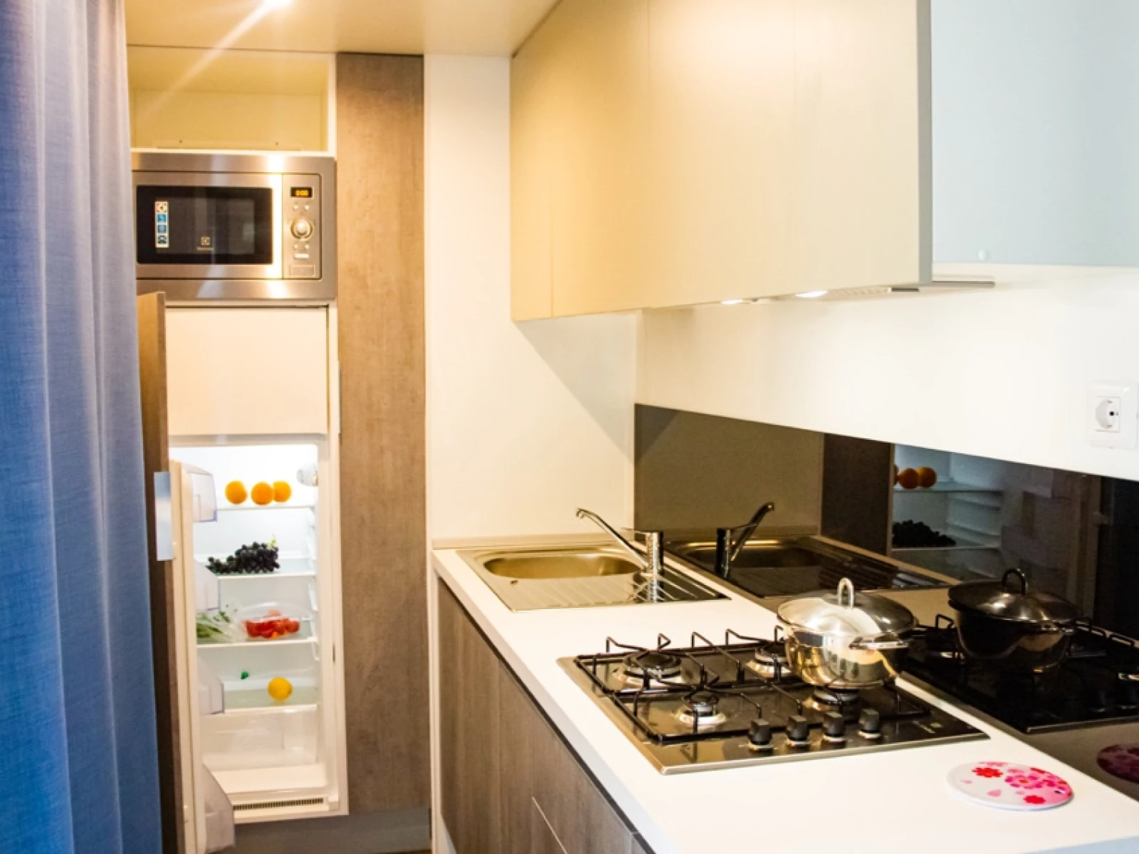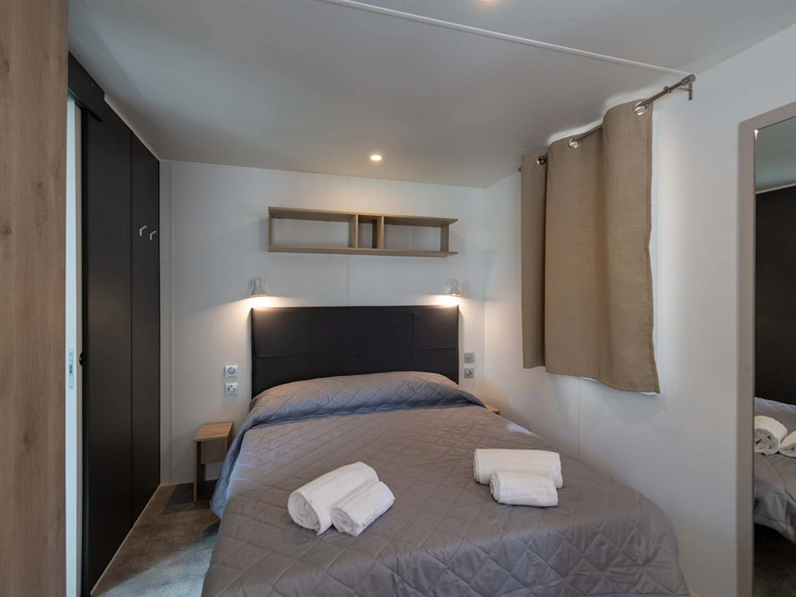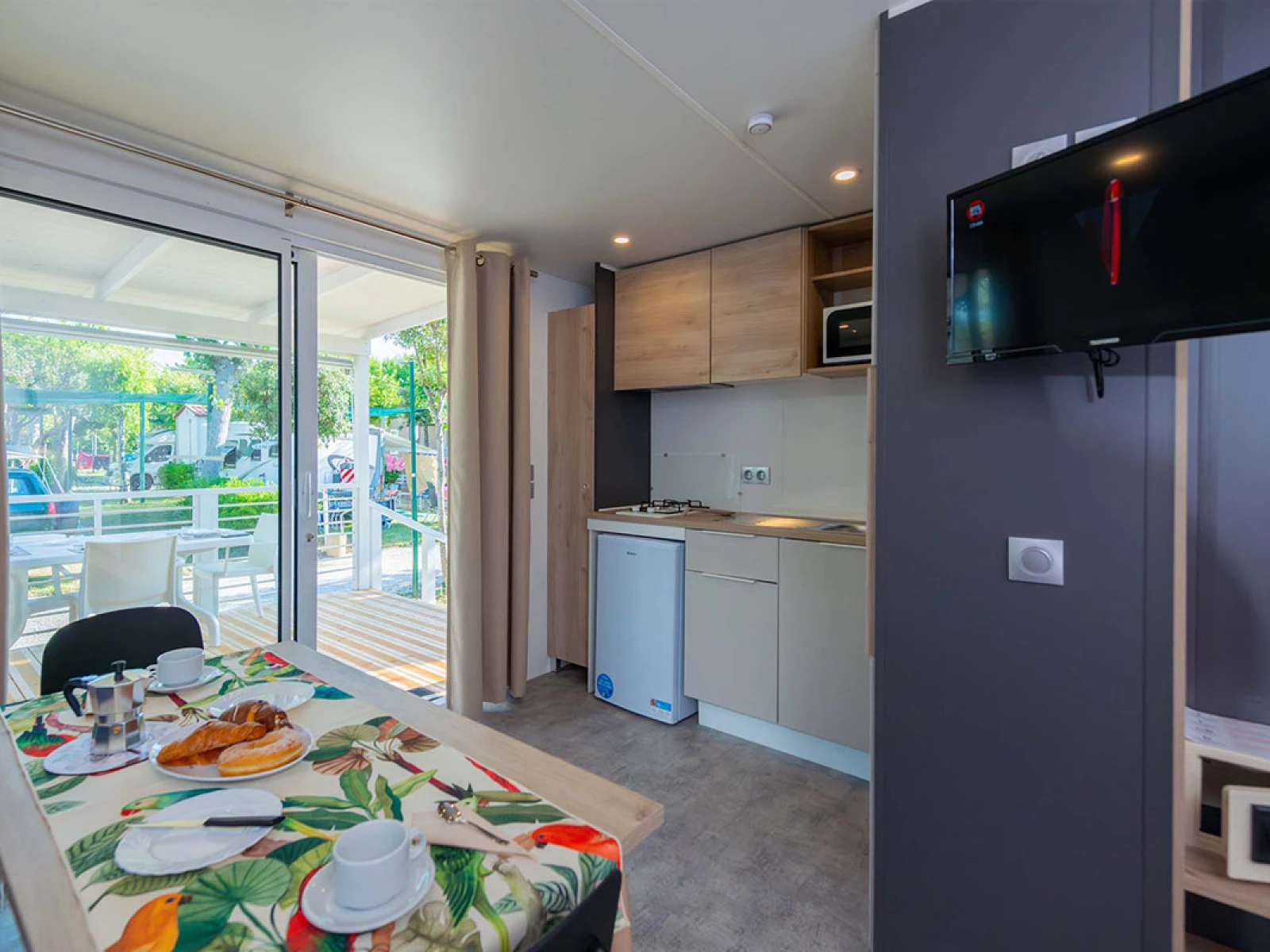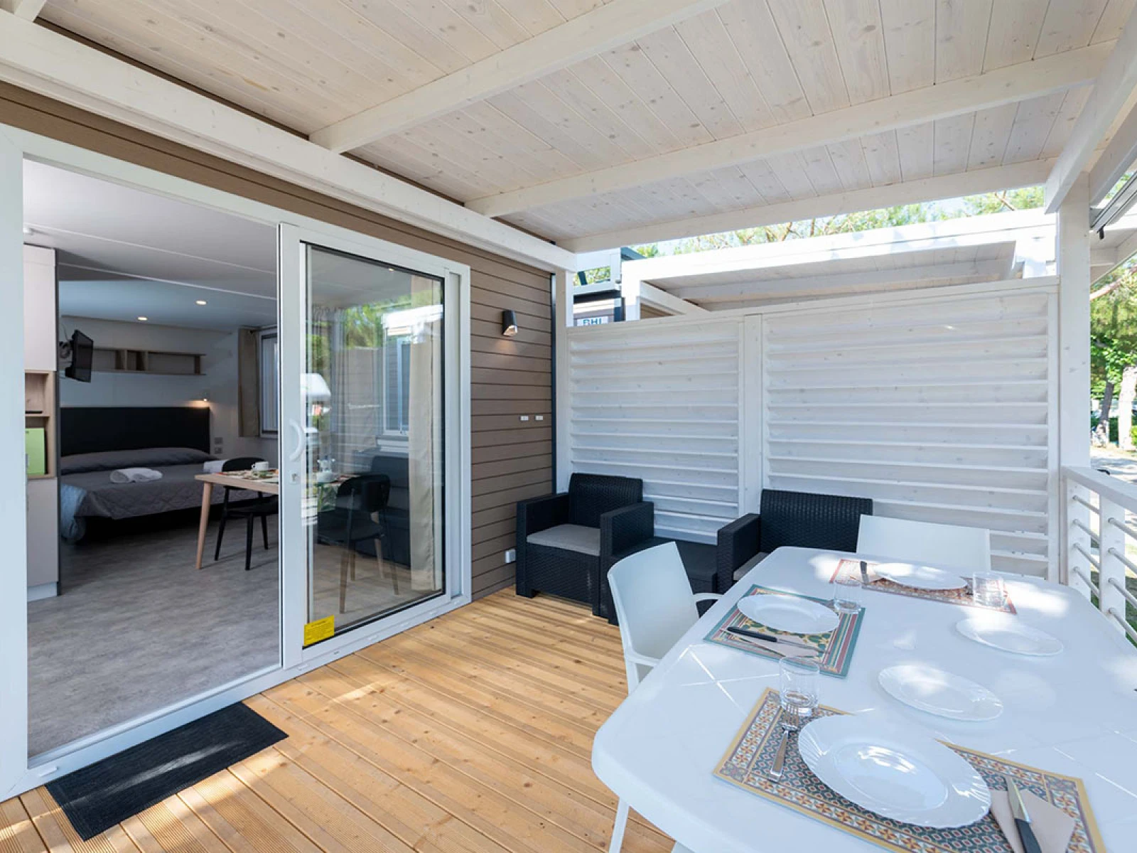 02. Casa mobile BaliLe Bali sono moderne mobile home open space con camera matrimoniale separabile da tenda, soggiorno con divano letto e cucina attrezzata. Dispongono di un bagno con doccia XXL, climatizzatore, TV e cassaforte. La veranda arredata da 12 m², immersa in un giardino privato di 60 m², offre uno spazio esterno ampio e rilassante. Ideali per 2+1 persone, con letto matrimoniale (160×200) e divano letto (130×190). |