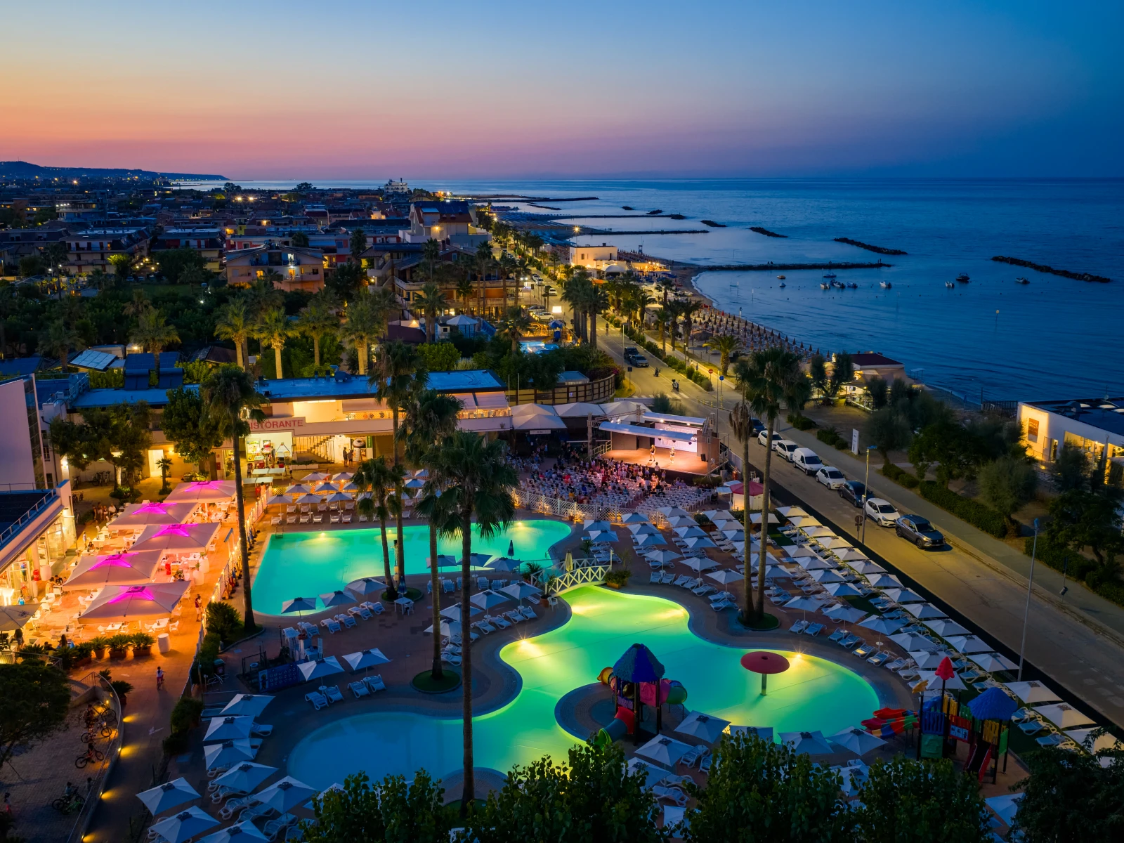 L’animazione è attiva tutti i giorni con un programma coinvolgente: mini club (4-12) e junior club (12-16), tornei sportivi, acquagym, balli di gruppo e spettacoli serali con cabaret, musica e intrattenimento per tutta la famiglia. Per chi ama il gioco all’aria aperta ci sono campi da tennis, calcetto e basket. I bambini possono divertirsi in un parco giochi attrezzato, sicuro e immerso nel verde. Sono disponibili anche biciclette con seggiolini e caschi, ideali per esplorare il lungomare in libertà.