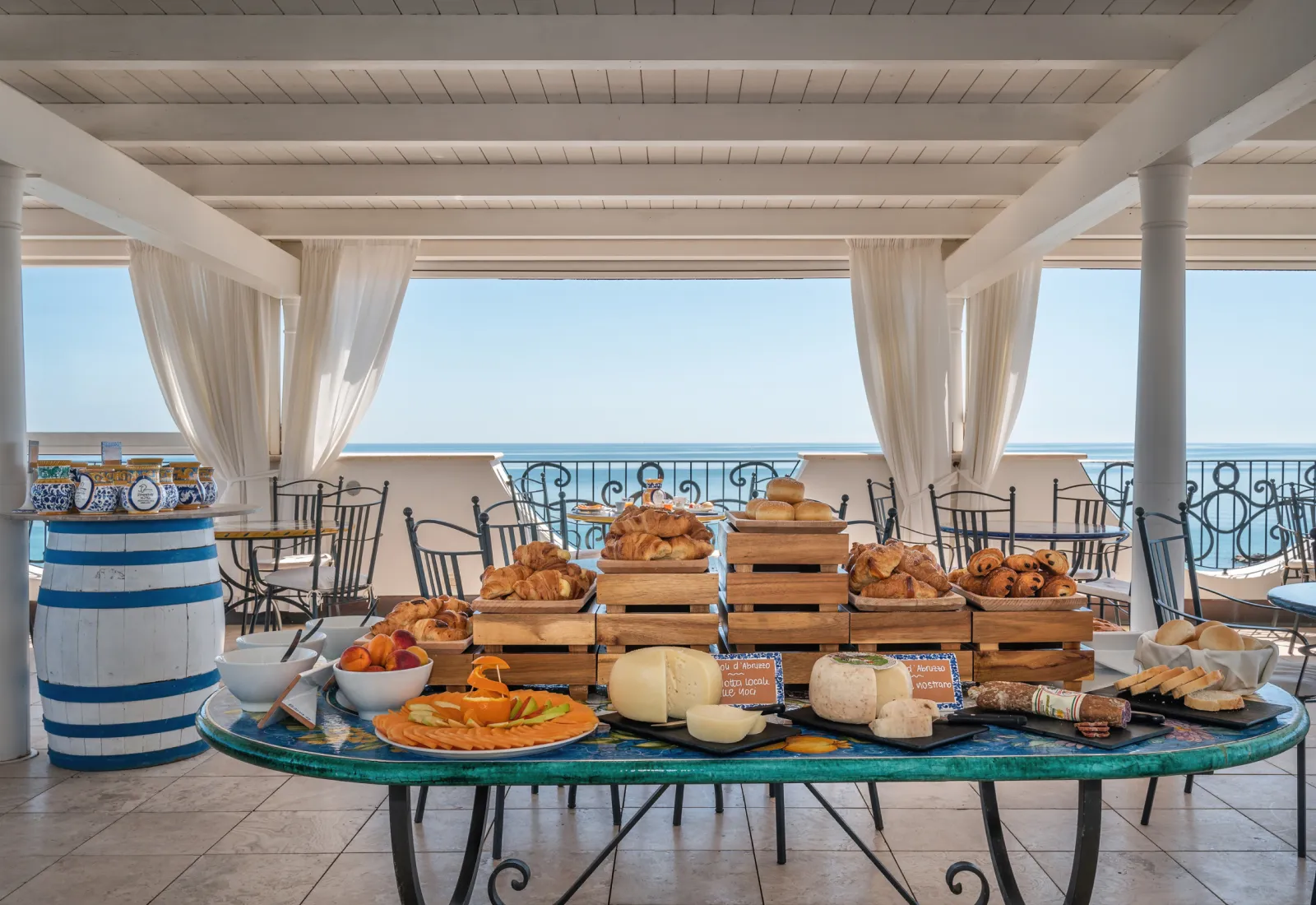 La giornata inizia con una ricca colazione sulla terrazza panoramica, tra croissant, formaggi, frutta e dolci fatti in casa, accompagnata dalla vista sul mare. A pranzo e a cena ti aspetta un buffet di verdure fresche, salumi, formaggi e specialità locali.