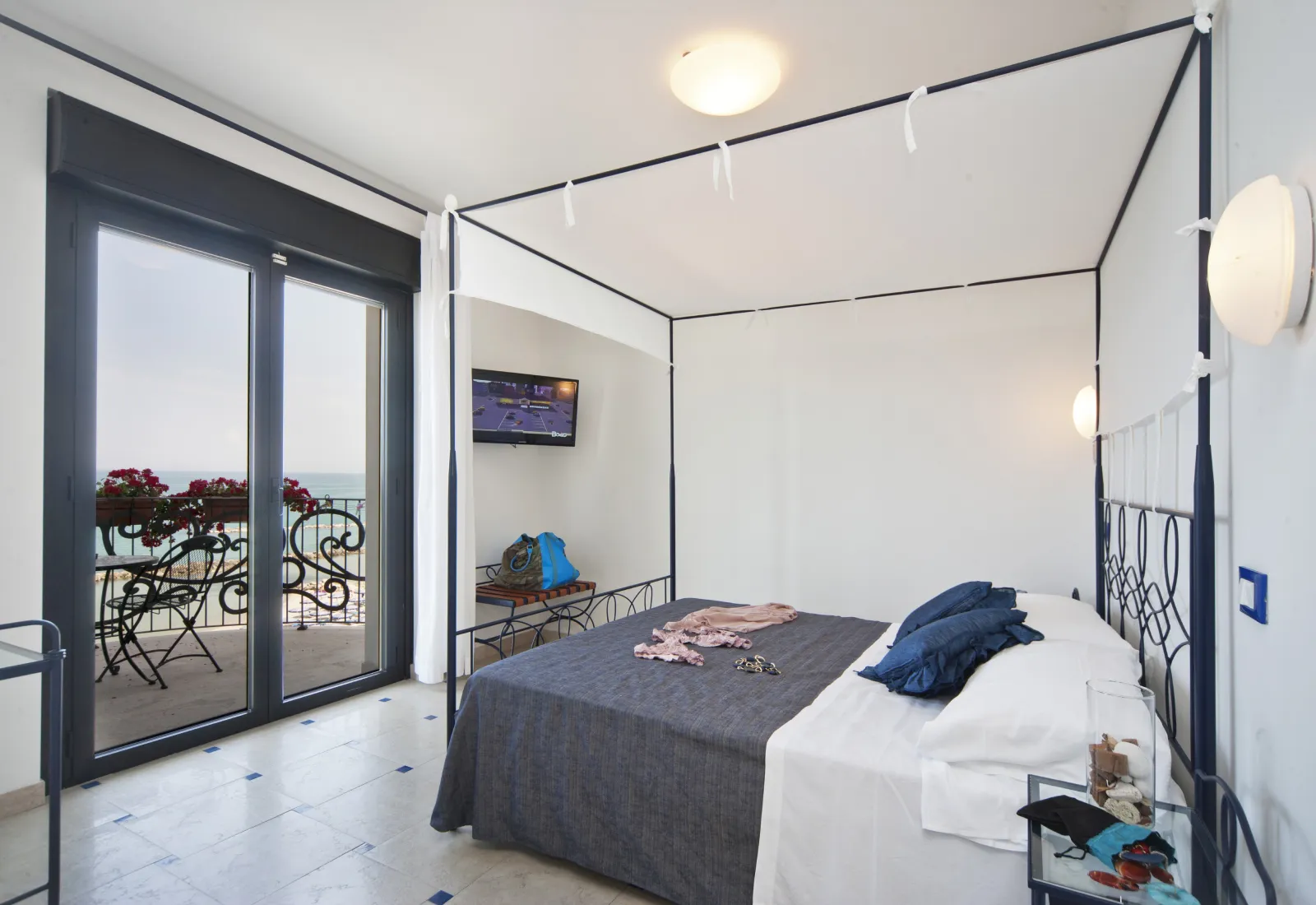 02. ExecutiveAl 3° e 4° piano, tipologia panoramica, queste camere sono pensata per le coppie, con letto a baldacchino, balcone con vista mare diretta e arredi raffinati che creano un’atmosfera romantica e rilassante. |